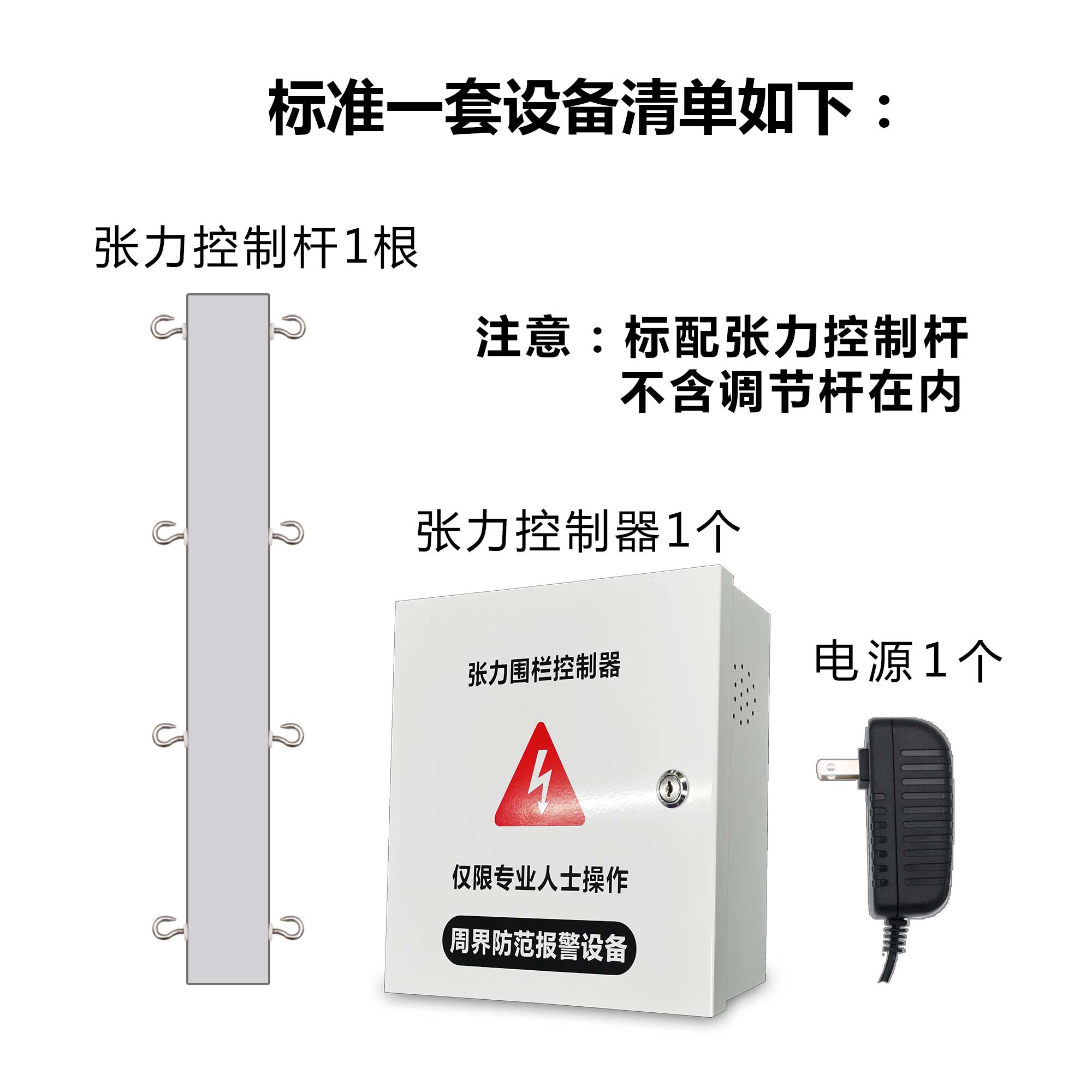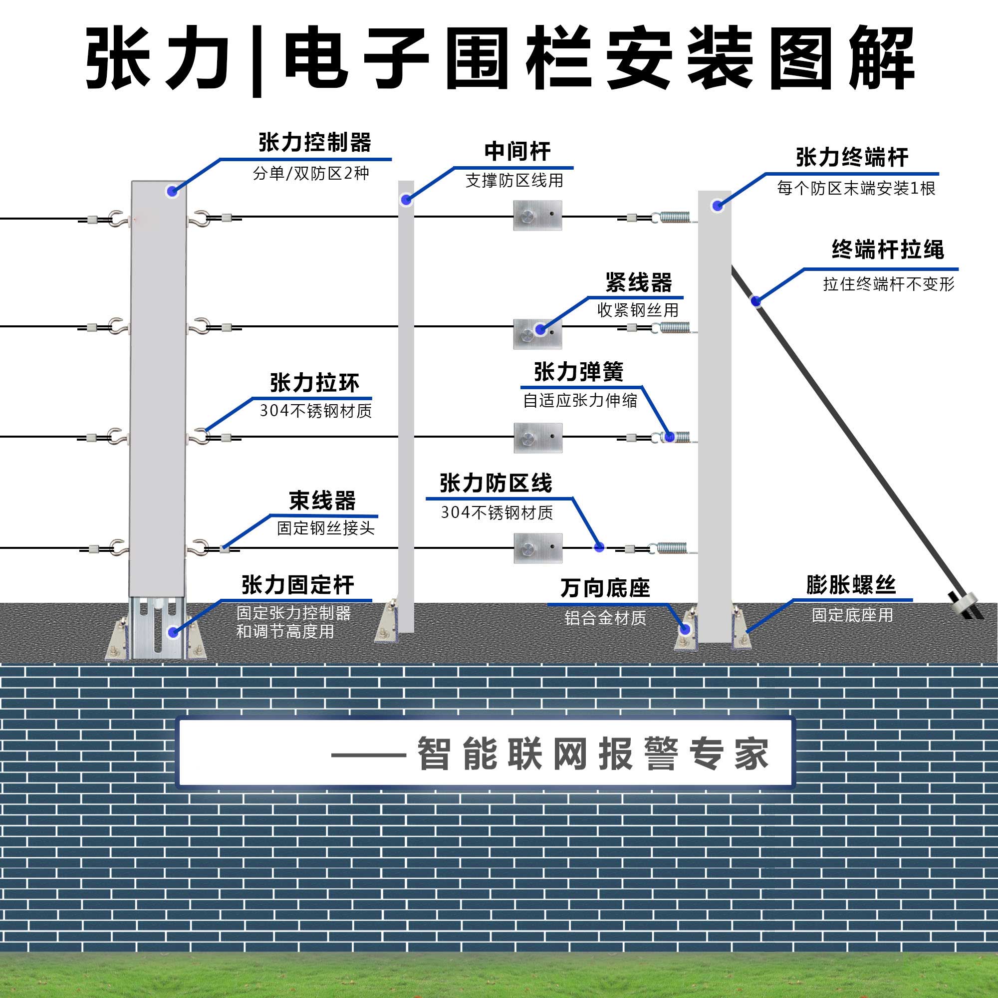 张力电子围栏周界报警系统由张力电子围栏主机/控制器、前端配件和报警中心的报警报警控制主机及接警管理软件 三部分组成。前端由控制杆(含张力围栏控制器/控制主机、接开关量的话还要陪控制模块)、受力杆/终端杆、转角杆/转向杆、支撑杆/过线杆、调节杆/固定杆、钢丝绳、弹簧、紧固件/束线器、滑轮、警示牌等组成。张力电子围栏报警系统由于采用全新的探测方式和特殊的信号处理方法,确保环境的变化不会引起张力静态值、张力报警值、张力报警阈值的变化,彻底改变了以往周界安防探测器环境适应性差、易误报的缺点。